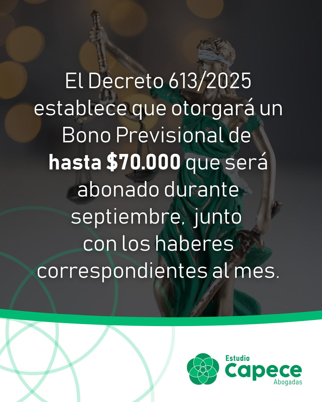 El Decreto 613/2025 establece que se otorgará un Bono Previsional de hasta $70.000, que será abonado durante septiembre junto con los haberes correspondientes al mes.